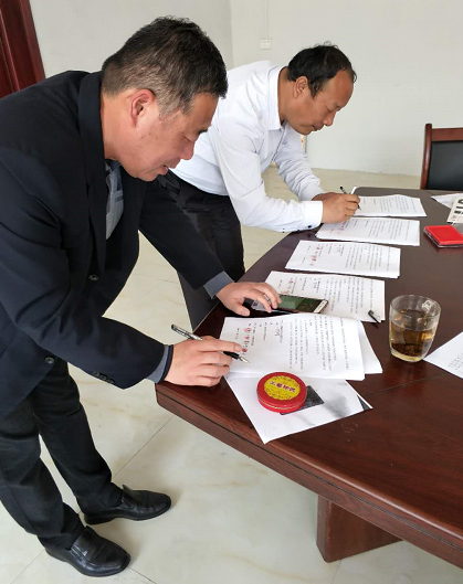 在縣百企辦逯亞森主任、大河屯鎮黨委張珀副書記、申沖村申慶振主任的見證下,各方與公司共同簽署了相關協議,正式將本批物資轉交給了申沖村委。