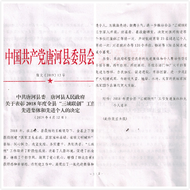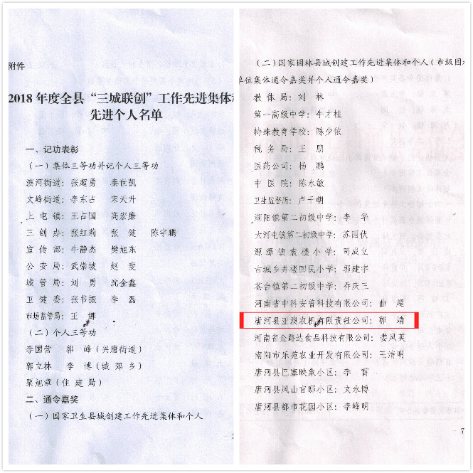 412日,唐河縣召開2018年度“三城聯創”總結大會。大會宣讀了表彰先進集體及先進個人的決定。亞澳農機獲得2018年度國家園林縣城創建工作先進集體。