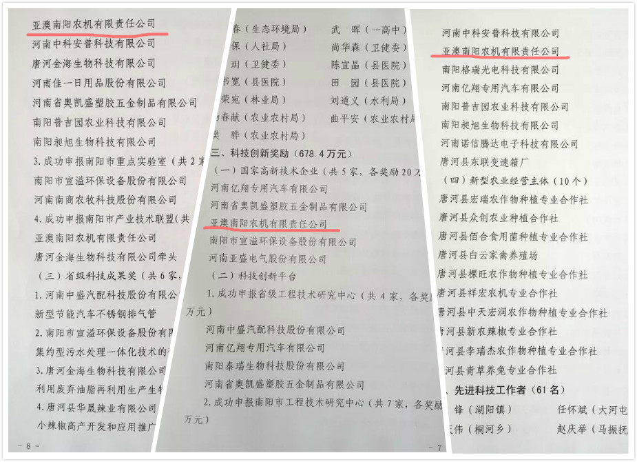 亞澳農機共獲得政府獎勵35萬元。包括成功申報國家高新技術企業20萬元獎勵、市級工程技術研究中心5萬元獎勵、南陽市產業技術聯盟10萬元獎勵10萬元。
